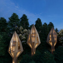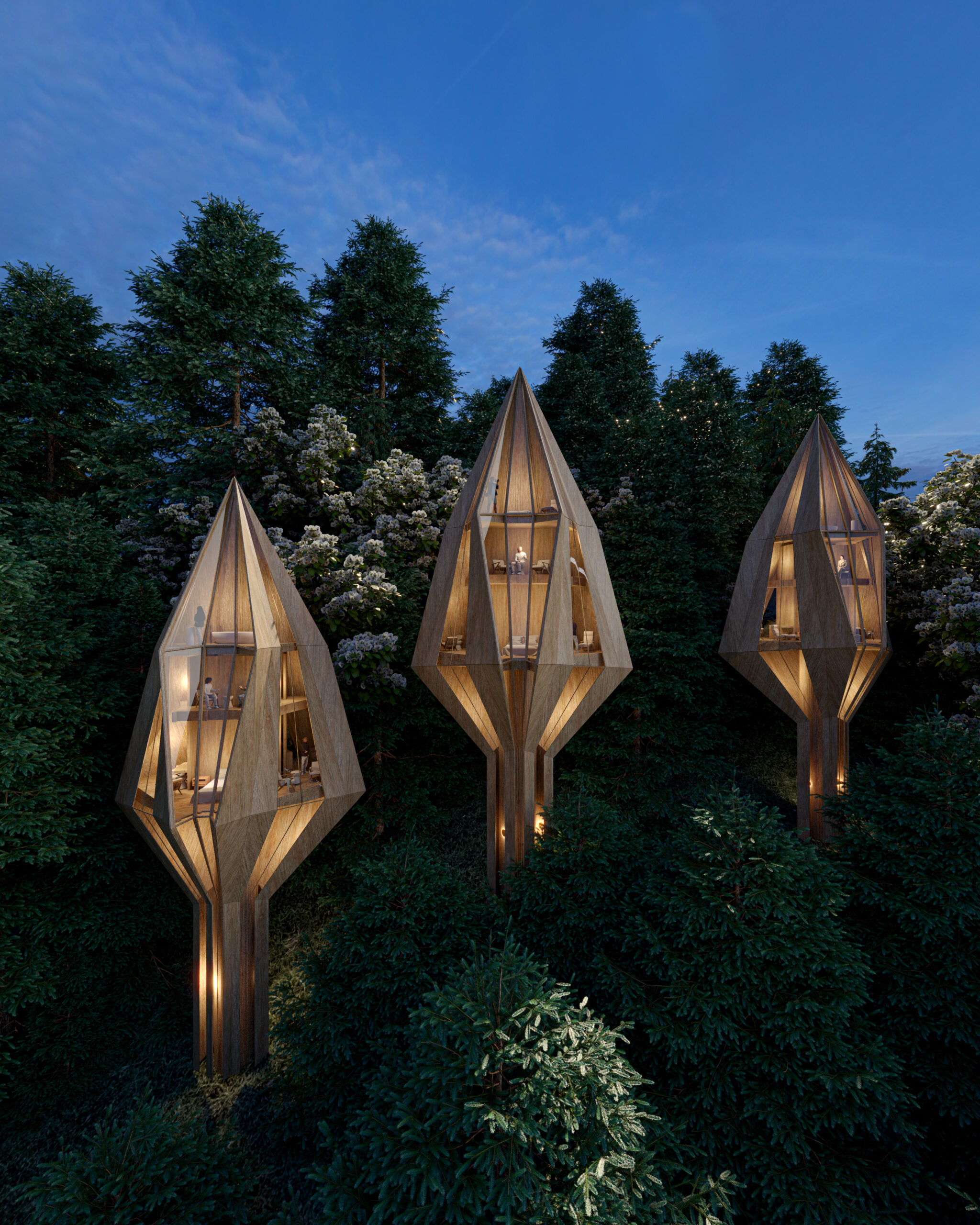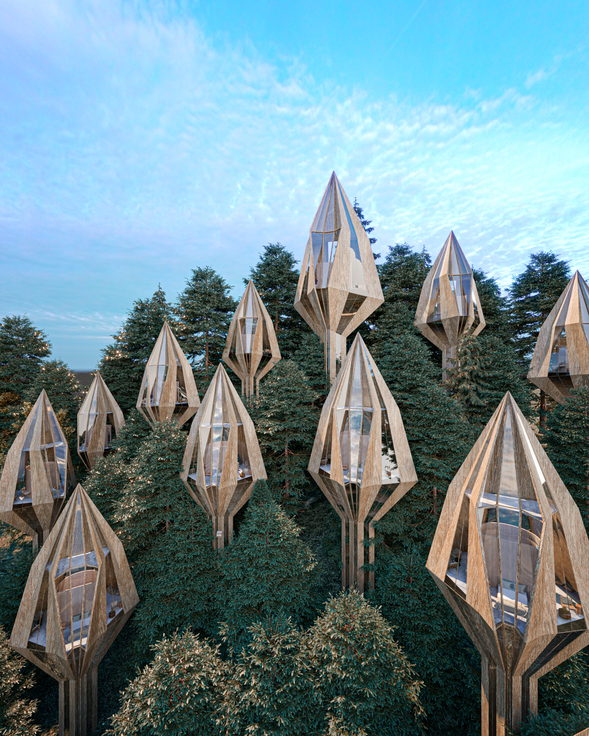 What sets PINEA apart is its fully off-grid operation, powered by AI-integrated systems that control energy use, interior climate, lighting, and water resources in real time. Each unit is capable of self-regulating its environment, harvesting solar energy, collecting and purifying rainwater, and recycling greywater for reuse. These systems are seamlessly integrated into the architecture, invisible yet omnipresent, enabling a lifestyle that is both luxurious and deeply responsible.