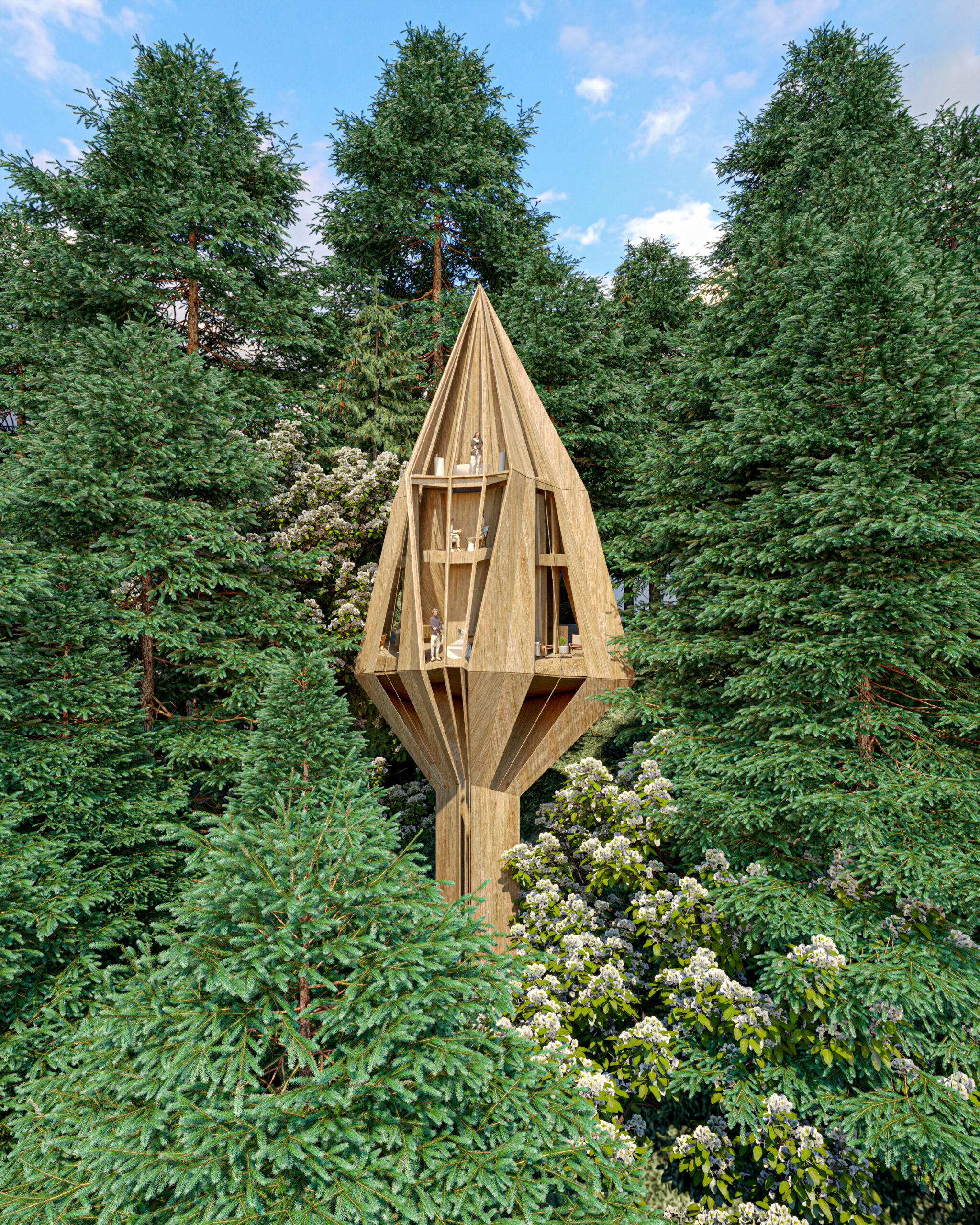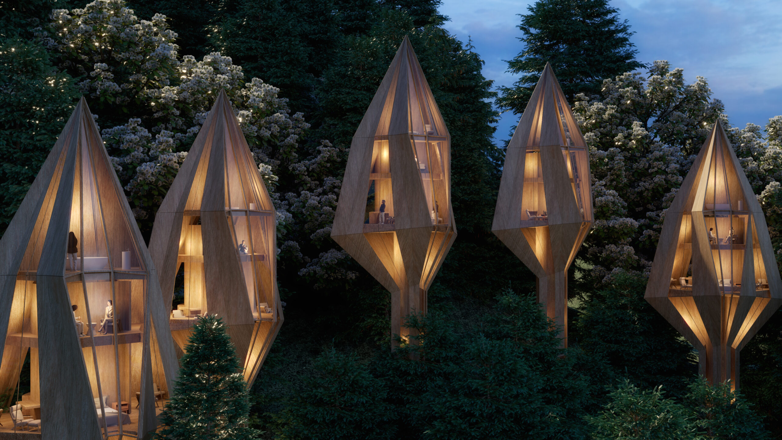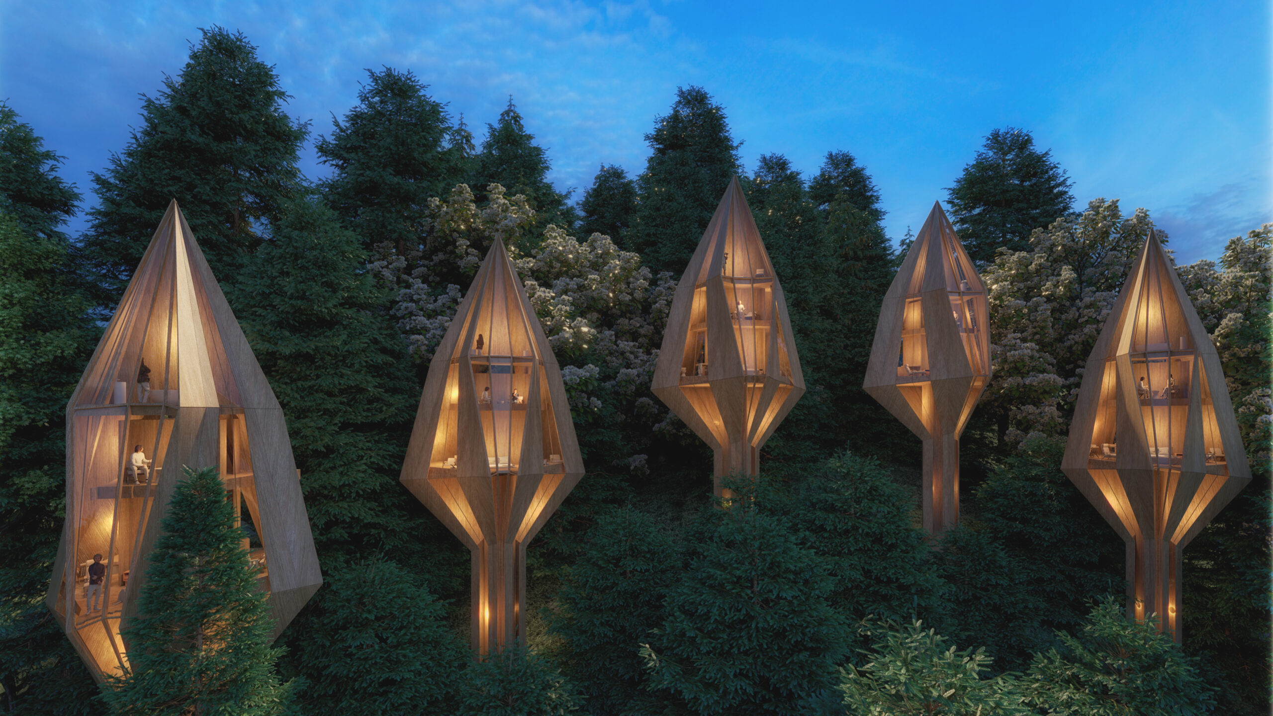 Inspired by the silent intelligence of pine forests in the highlands of All’En, PINEA mimics the behaviors of natural ecosystems. In pine forests, each tree grows in harmony with others, sharing light, nutrients, and space through a self-regulating balance perfected by nature. Drawing from this model, the PINEA resort grows organically through a modular system in which each unit operates independently, yet contributes to the overall balance and energy flow of the entire site. Each structure is algorithmically positioned to respond to sunlight, topography, and ecological sensitivity, with minimal impact on the natural terrain. The buildings rise gently out of the landscape, anchored without deep foundations, allowing the forest to remain largely untouched.